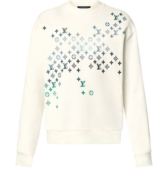 This smart ivory sweatshirt in compact cotton jersey is inspired by the dreamlike shifting colors of the aurora borealis of this collection. The relaxed silhouette is embellished with a scattered embroidered Monogram across the front and back in luminesce