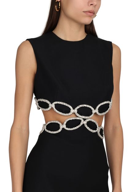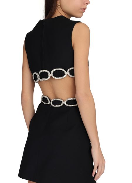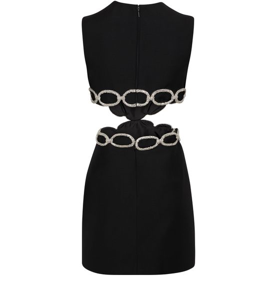 This Valentino Embroidered dress with cutouts is a stunning short dress with a tailored fit, featuring a round neck and sleeveless design. The dress stands out with its intricate graphic cut-outs and exquisite embroidered details, creating a unique and eye-catching look.