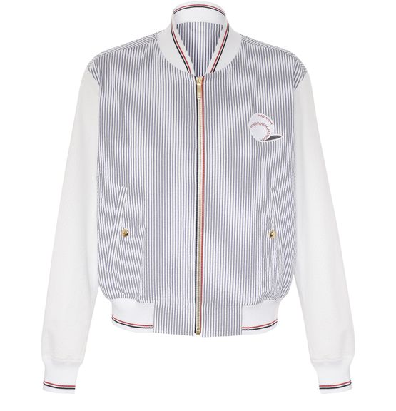 Featuring the designer's signature bands on the cuffs, neck and fastening, this embroidered men's jacket is designed by Thom Browne. Featuring contrasting stripes on the sleeves and an embroidered baseball on the chest, this piece also has side pockets with gold piping that add a sophisticated note.