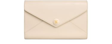 Unveil Celine's Enveloppe wallet on chain. This elegant piece features gold finishing and a practical snap button closure. Inside, you'll find a main compartment, an inner flat pocket, and four credit card slots. The removable chain adds versatility, making it perfect for any occasion.