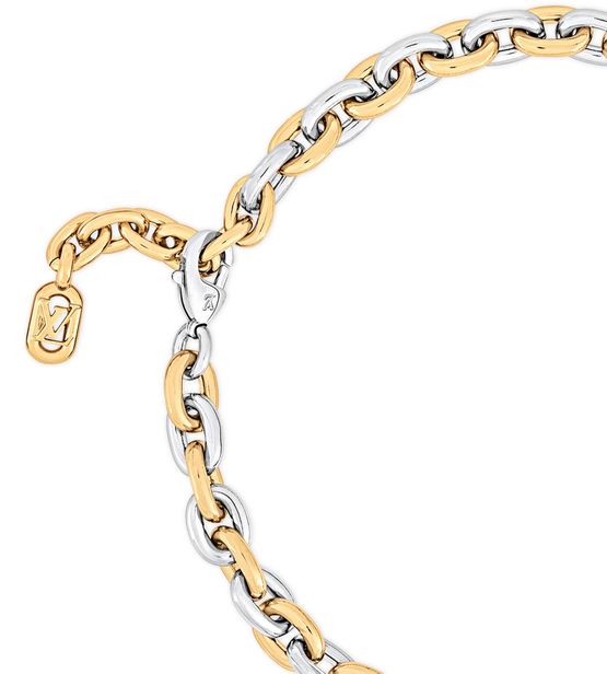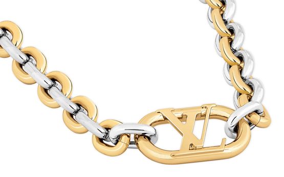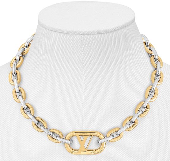 This Everyday Chain LV necklace combines an iconic House signature with a modern look. It showcases the LV Initials as a bold accent, placed in the center of a chunky, adjustable link chain made of two-tone metal. This item can be paired with the matching bracelet and earrings.