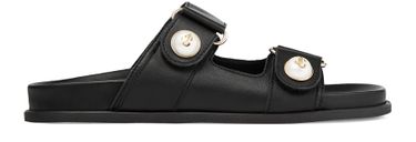 Jimmy Choo's Fayence slides are crafted from smooth leather, featuring an open round toe and a thick outer sole for comfort and style. With a subtle logo at the back, these slides exude a luxurious and sophisticated vibe perfect for any casual outing. Enhance your look with these chic and modern slides.