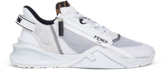 Slip-on sneakers with elasticated laces, side zip and corrugated sole with engraved F. Fendi Flow lettering embossed on the heels. Made of a mix of tech fabrics and suede in black. Embellished with Lycra® details. Tongue with FF motif. EVA sole. Made in Italy