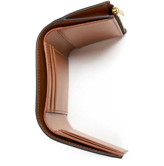 • Description : magnetic closure, flap closure, visible topstitching, logo in gold letters, front logo, interior slots for cards.