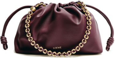 Reveal Loewe's medium Flamenco bag in mellow nappa lambskin, crafted from smooth leather with a refined chain strap. The drawstring closure and front logo add a modern touch, blending signature detailing with functional elegance for a statement shoulder bag.