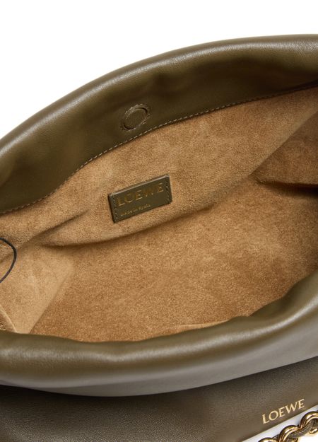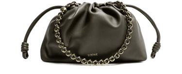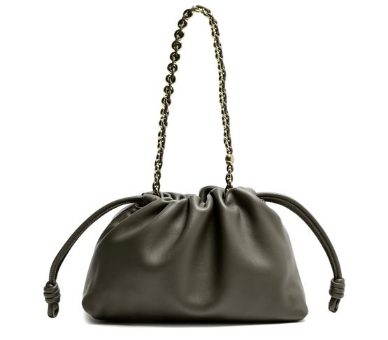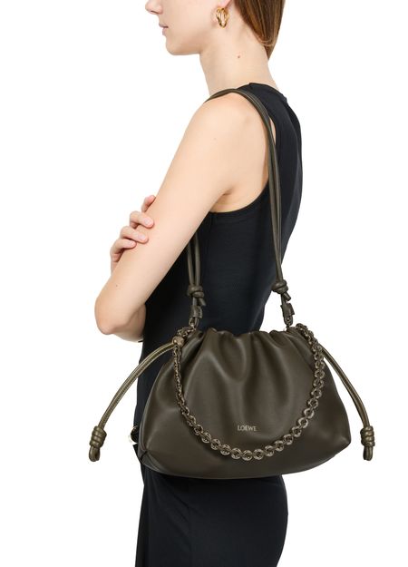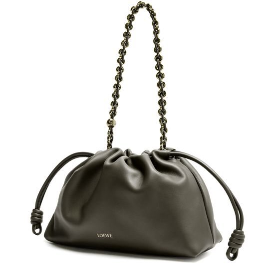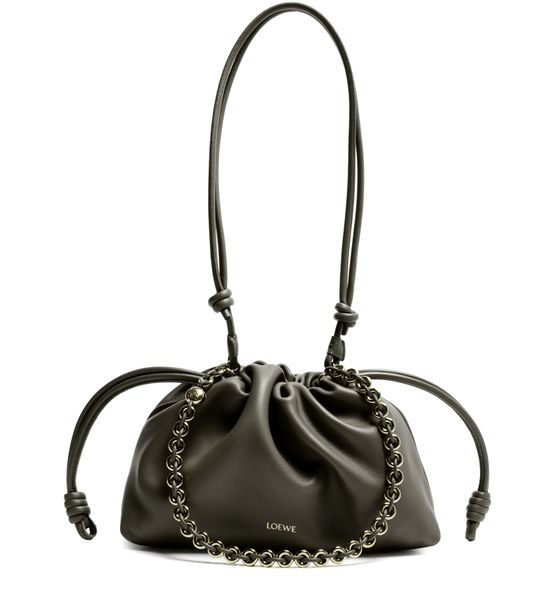 Reveal Loewe's medium Flamenco bag in mellow nappa lambskin, crafted from smooth leather with a refined chain strap. The drawstring closure and front logo add a modern touch, blending signature detailing with functional elegance for a statement shoulder bag.
