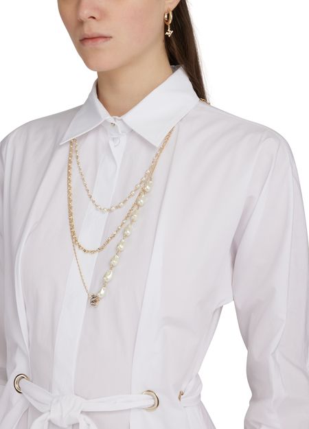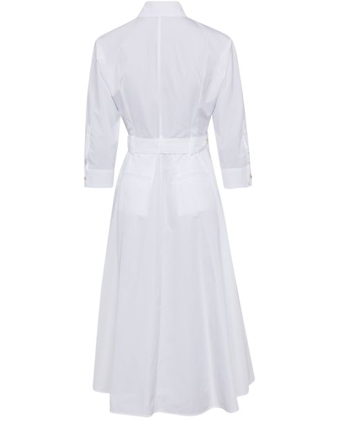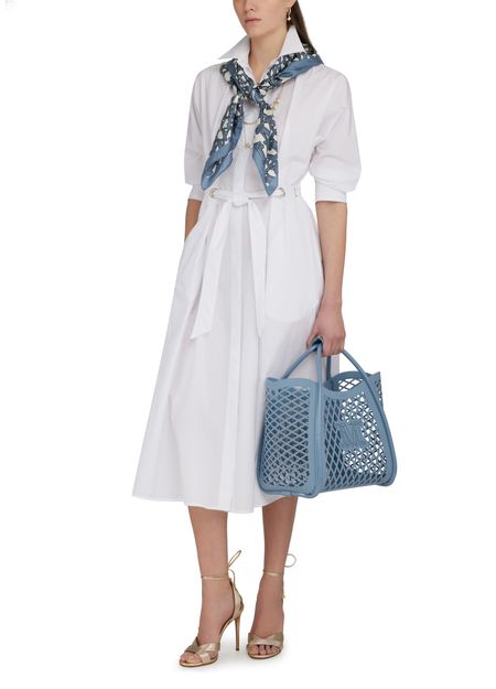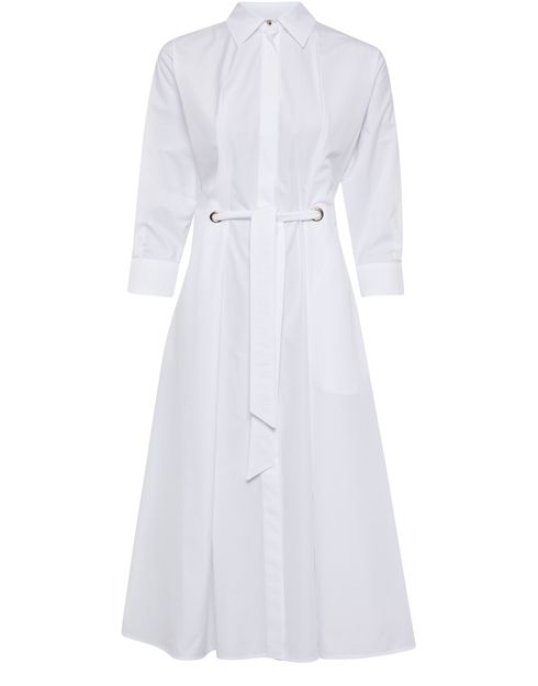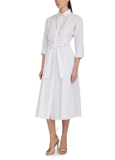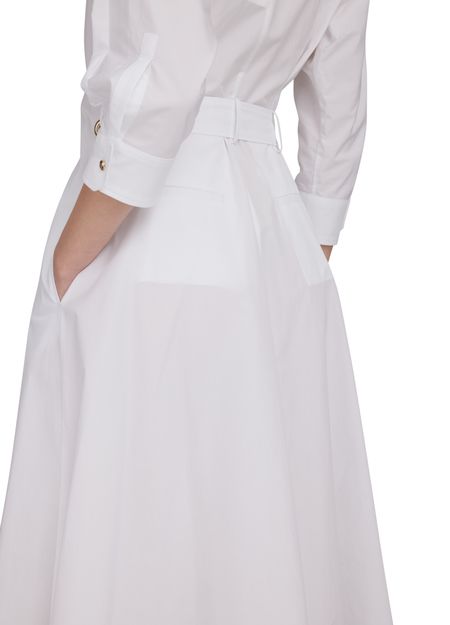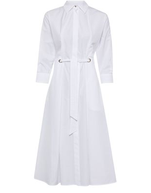 Max Mara's Flavio shirt dress is a versatile midi dress with elegant pleated details. It features a drawstring for adjusting the waist, allowing for a customized fit. The flared cut adds a feminine touch to the classic shirt dress silhouette, making it a perfect choice for both casual and formal occasions.