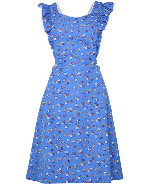 Reveal Miu Miu's floral print pinafore dress, a knee-length silhouette adorned with delicate ruffle details and a round neck. Sleeveless with ruffled sleeves and shoulder straps, this piece brings a fresh, feminine touch to any occasion, blending playful elegance with modern flair.