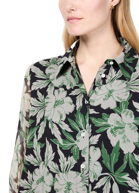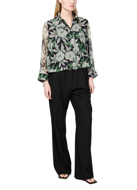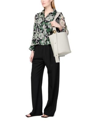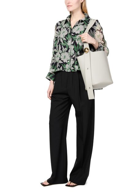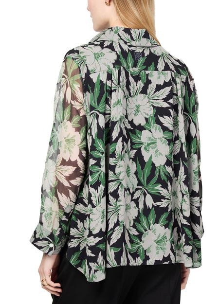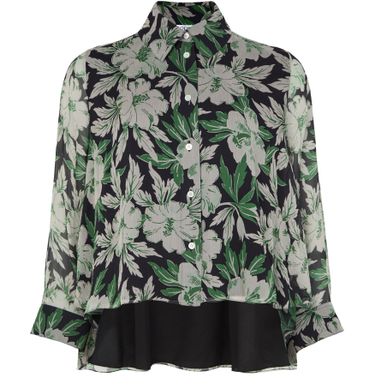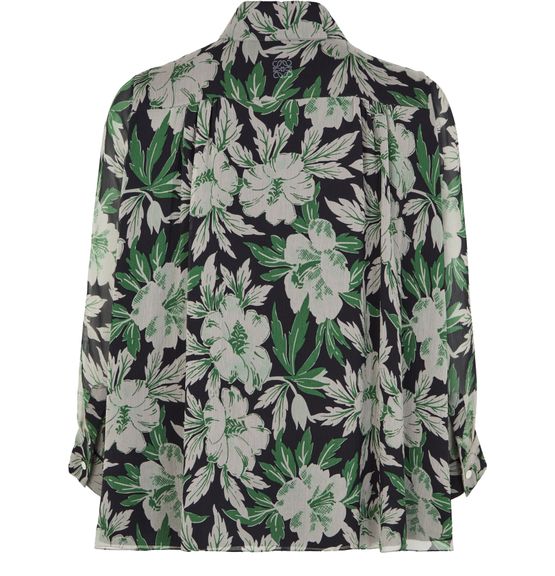 Loewe's floral print silk shirt showcases a captivating design with a front buttoned closure and a classic shirt collar. Its long-sleeved silhouette and regular length offer versatility, while visible stitching adds a touch of artistry. Perfect for elevating any outfit, this shirt embodies elegance and contemporary style.