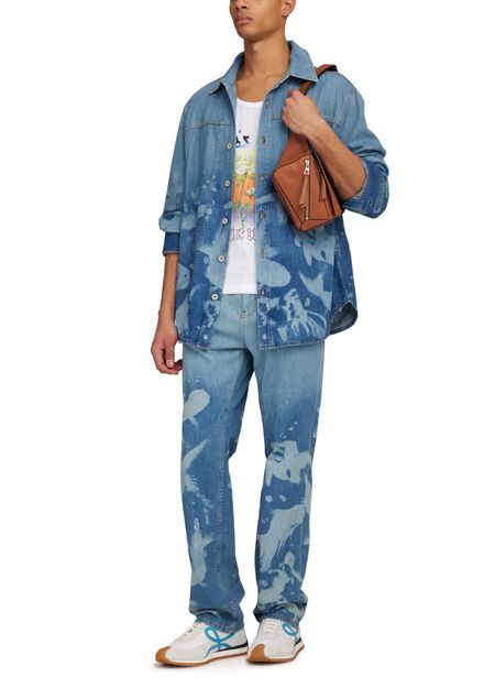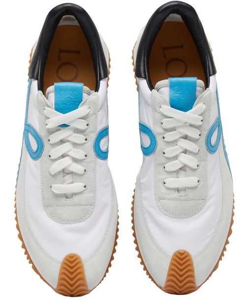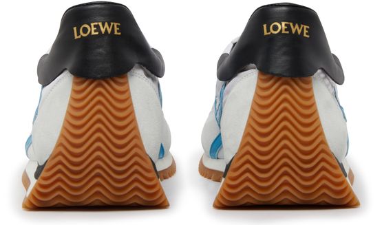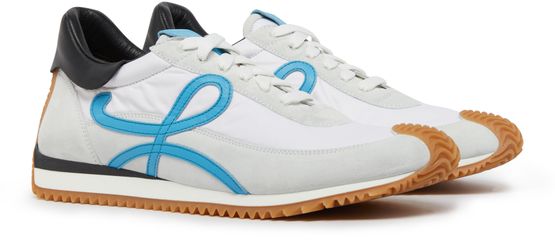 The Loewe Flow runner sneakers are a stylish pair of lace-up shoes with a thick, notched sole for added comfort and durability. They feature visible stitching details and a logo on the side, adding a touch of sophistication. The logo on the heel further enhances the brand's signature style.