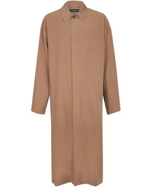 This loose-fitting coat is a piece by Balenciaga. It has a long, straight cut with a classic collar and two large exterior pockets.