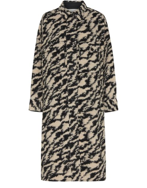 Etoile Isabel Marant's Fontizi long coat showcases a front buttoned closure and a tailored collar, exuding sophistication. With long sleeves and an all-over printed design, it features flap and patch pockets for practicality. An appliquéd logo on the chest and a logo at the back label add a stylish touch.