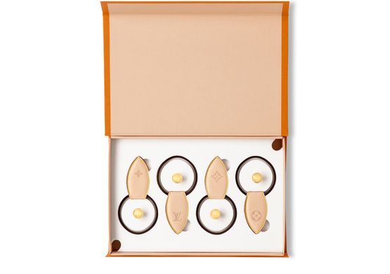Designed to display Louis Vuitton square silk scarves, the Frame System is composed of four hooks, made from the Maison’s signature natural cowhide. The leather is embossed with Monogram motifs, while the engraved gold-color rivets recall those found on historic Louis Vuitton trunks. The system adjusts to fit silk squares of every size.