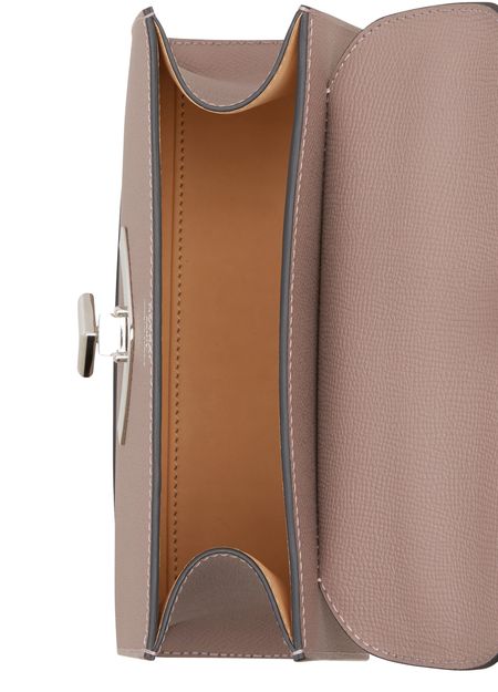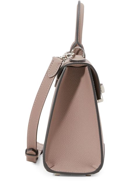 Description : Leather handle, flap closure, metallic logo clasp, brand's monogram, visible stitching, metal with a silver finish.