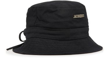 The Jacquemus Gadjo bucket hat features a round crown and short visor, with visible stitching and silver finishes. Embellished with a strap and tie fastening, it also boasts a metallic logo on the front. With a head circumference of 58 cm, it's a stylish and practical accessory for any outfit.