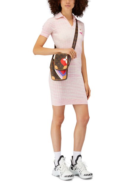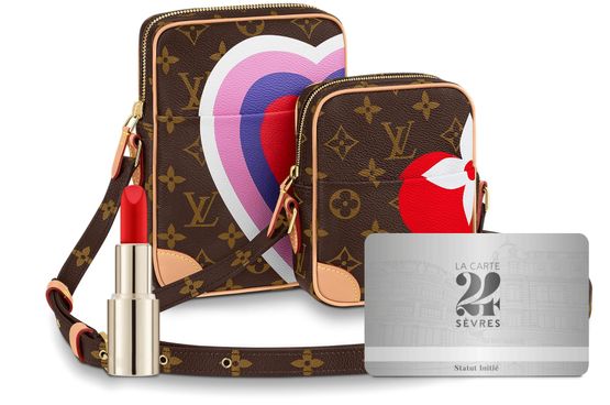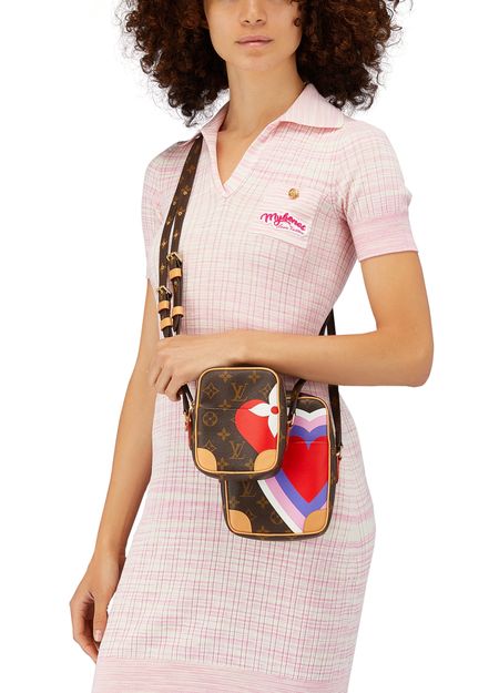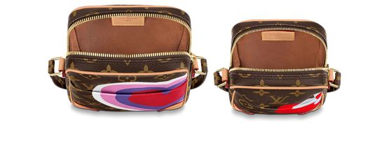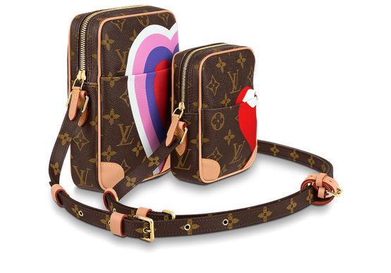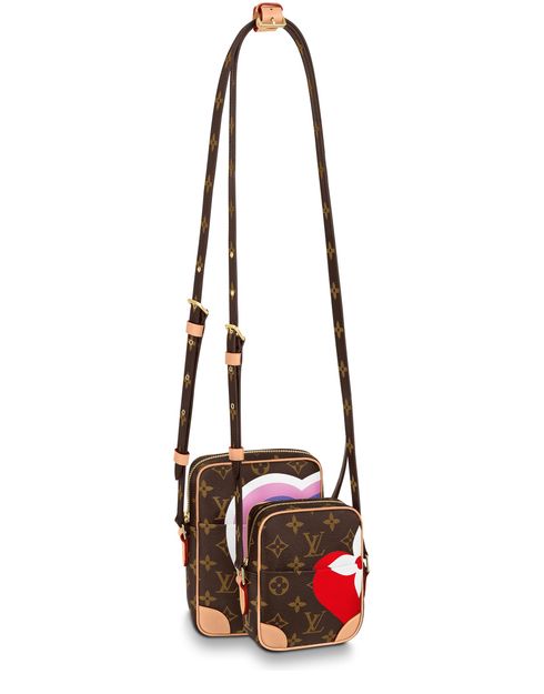 The Paname Set is a set of two small bags connected by a strap that holds them together. Fashioned from Monogram Canvas with large colorful prints of hearts and Monogram Flowers, it’s part of the Game On capsule collection. Both bags have outside pockets and adjustable straps in Monogram canvas.