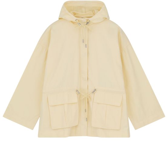 • Description : Adjustable drawstring neckline, dropped sleeve, long-sleeved, flap pockets, gathered at the waist, zipper closure, crossover fastening, detachable hood with snap buttons, side insert.