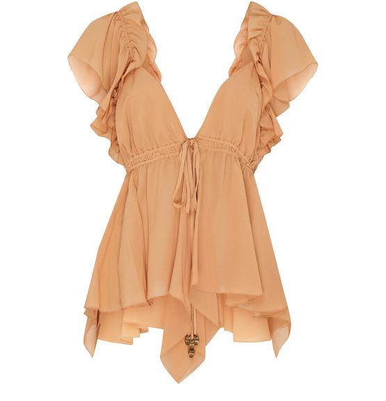 Chloé's Gathered silk georgette camisole top showcases a captivating backless design with short sleeves and a regular length. Its plunging neckline adds a touch of allure, making it an exquisite choice for elegant evenings. Effortlessly blend sophistication and comfort in this stunning blouse, perfect for any stylish occasion.