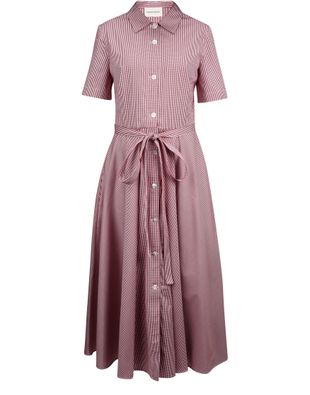 This is the Gingham shirt dress by Mansur Gavriel. It features short sleeves, buttons from top to bottom and a tie belt to accentuate the waist.