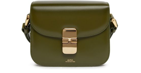 APC's Grace mini bag features a narrow adjustable strap for versatile wear. The iconic logo on the front adds a touch of sophistication to the smooth leather design. The flap closure is secured with a gold closure, making it both stylish and practical for everyday use.