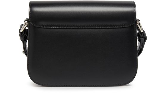 APC's Grace Small bag features a printed logo with silver letters on the front flap closure, giving it a sleek and modern look. The bag also includes a silver finish, wide strap, and a single handle for versatility. It can be worn on the shoulder or carried with the adjustable strap for added convenience.