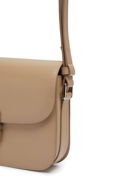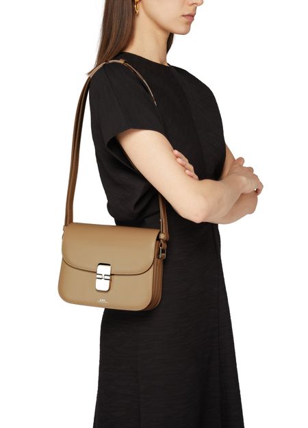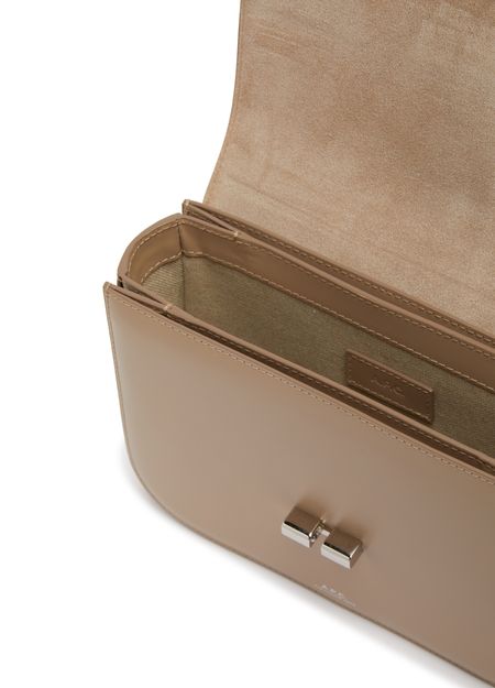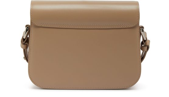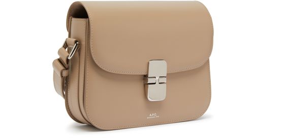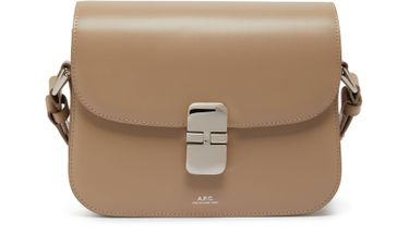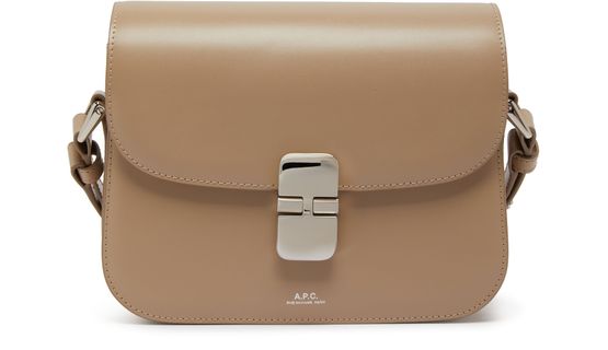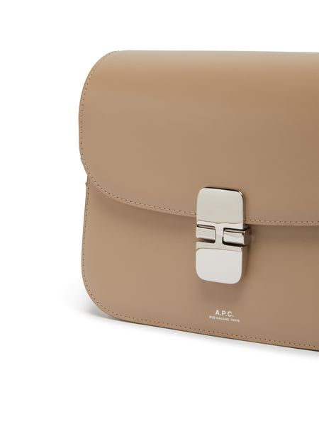 APC's Grace Small bag features a printed logo with silver letters on the front flap closure, giving it a sleek and modern look. The bag also includes a silver finish, wide strap, and a single handle for versatility. It can be worn on the shoulder or carried with the adjustable strap for added convenience.