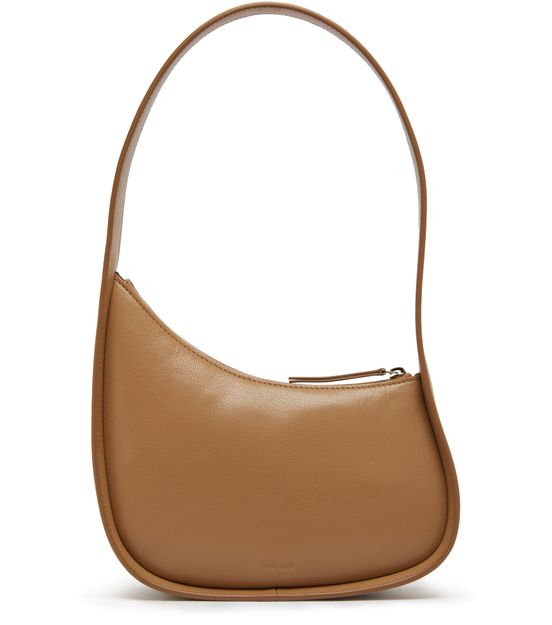 The Row's Half Moon shoulder bag showcases a sleek silhouette with a zipper closure for secure storage. Its single handle and wide strap allow for effortless wear on the shoulder. The visible topstitching adds a touch of sophistication, making it a versatile accessory for any occasion, blending elegance with practicality.
