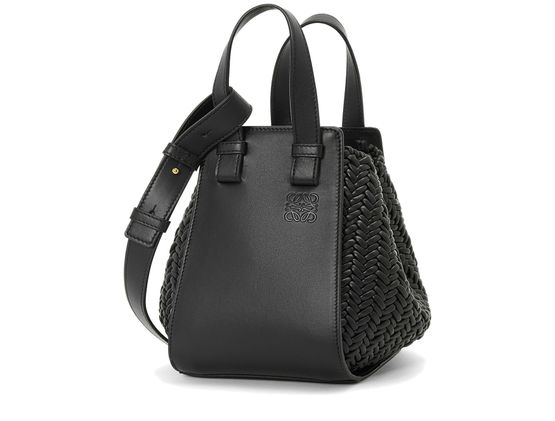 Loewe's Hammock Compact Woven Bag is a versatile accessory with a thin strap and carabiner for hand carrying or shoulder wearing. It boasts a single compartment with a luxurious gold finish and a detachable strap for added convenience.