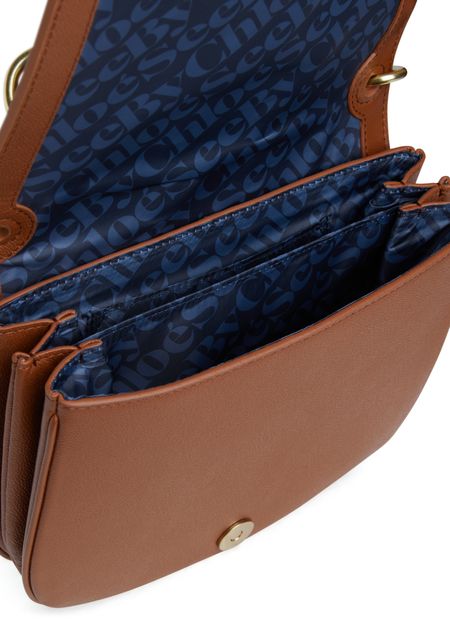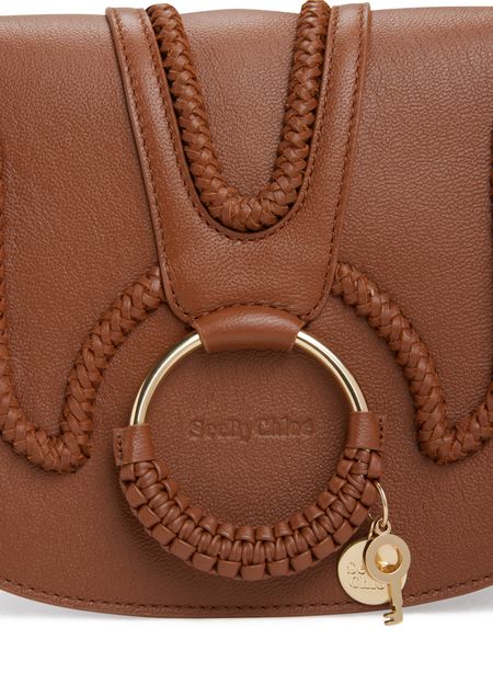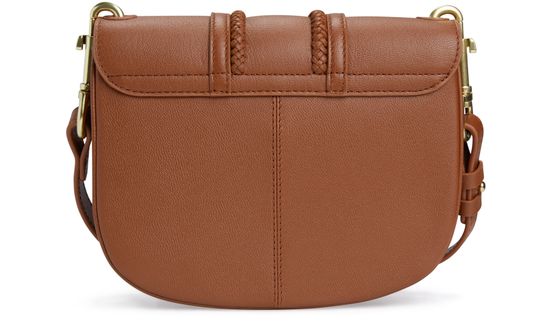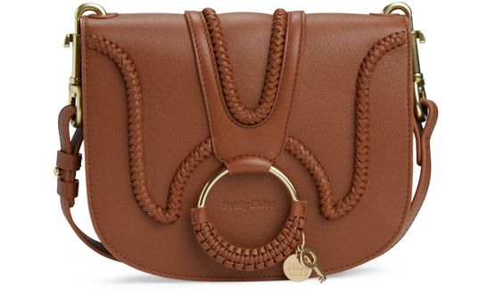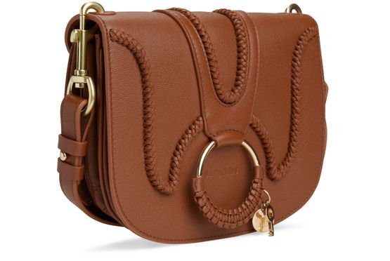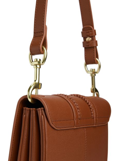 Description : Adjustable, detachable strap, visible stitching, flap closure, logo embossed on the front, braided leather details, signature suspended ring, worn on the shoulder.