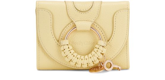 A miniature format with maximum detail create the personality of this Hana compact wallet from the See by Chloé collection. The flap of this rectangular model features rounded and feminine inserts that enhance the golden ring with its woven finish, the emblem of the house. Two metallic charms adorn this wallet, a precious signature touch from the brand.