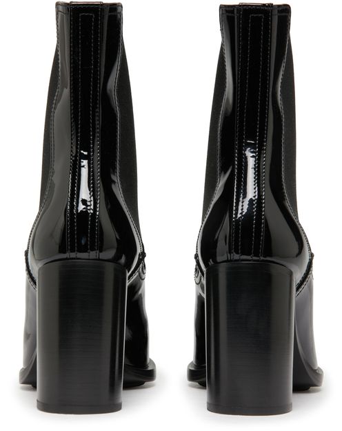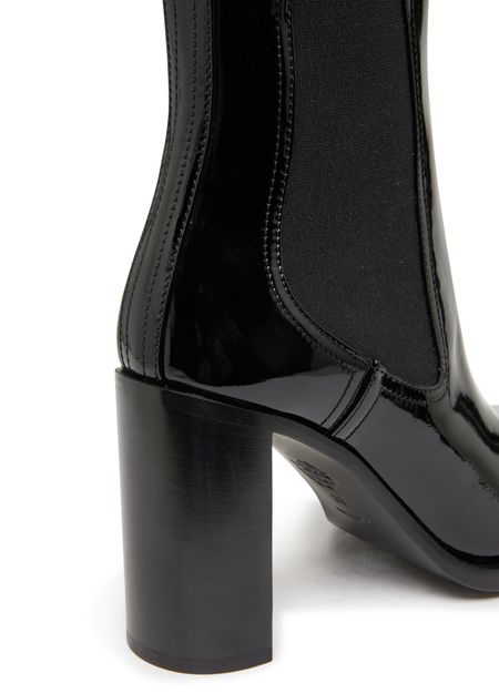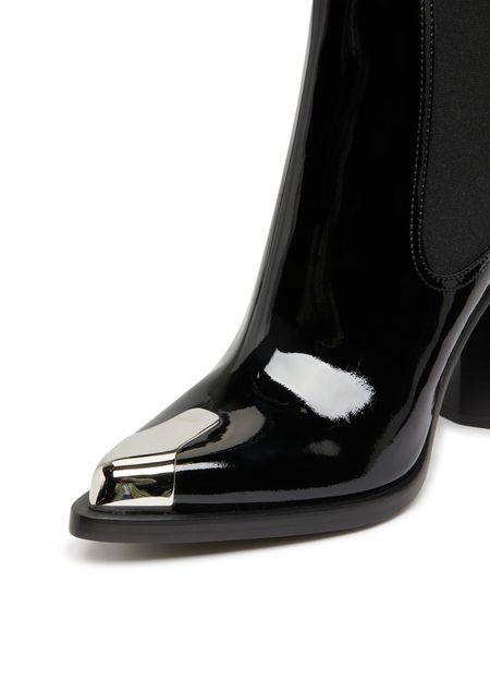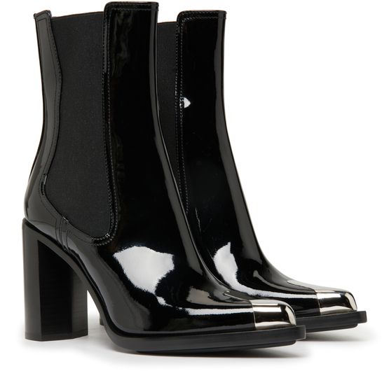 Alexander McQueen's heeled boots are made of patent leather and feature a sleek pointed toe. The elasticated sides provide a comfortable and secure fit, while contrast details add a modern touch. The pull-on design makes them easy to slip on and off, making them a versatile and stylish addition to any wardrobe.