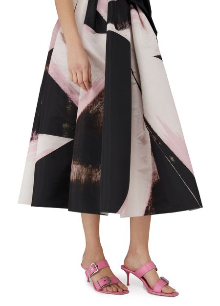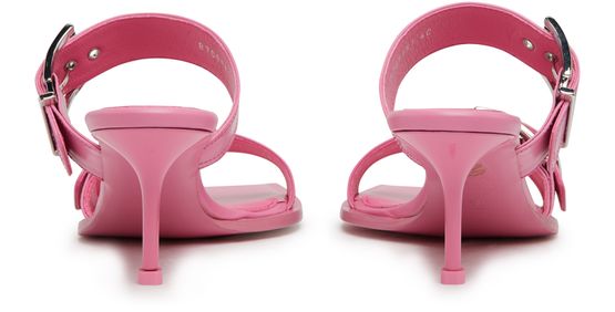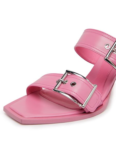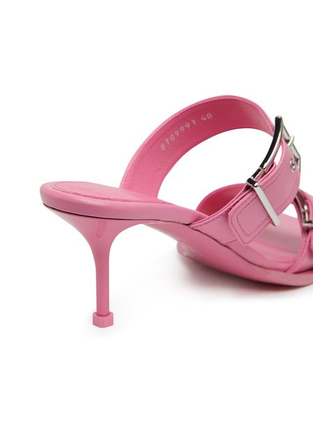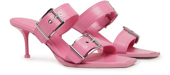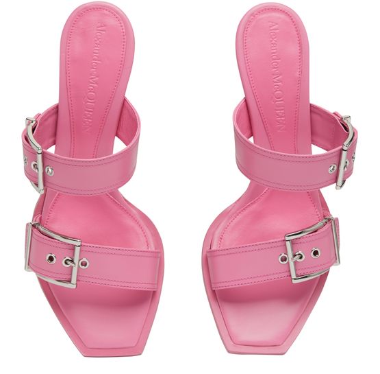 Alexander McQueen's heel sandals feature graphic cut-outs and a unique square toe design. The very thin sole adds a sleek, modern touch, while wide buckled straps provide a secure fit. The logo-printed insole, metal finish, and pull-on design create a luxurious and effortlessly stylish look that is sure to turn heads.