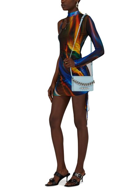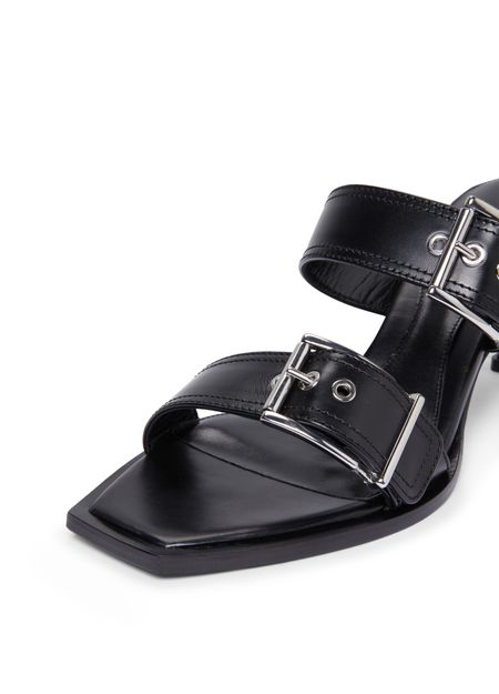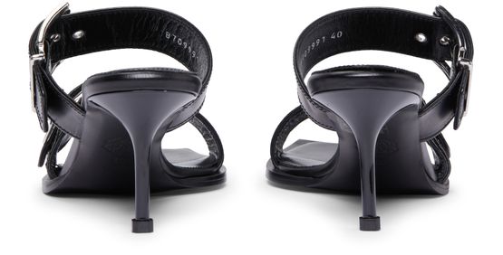 • Description : Graphic cut-outs, square toe, very thin sole, unique heel, wide buckled straps, logo-printed insole, metal finish, pull-on design.