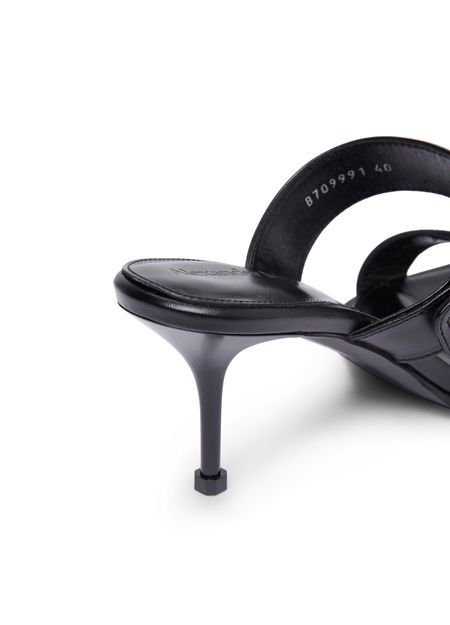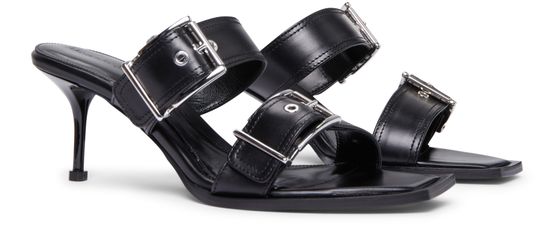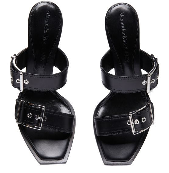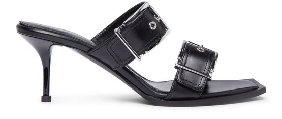 Alexander McQueen's heel sandals feature graphic cut-outs and a unique square toe design. The very thin sole adds a sleek, modern touch, while wide buckled straps provide a secure fit. The logo-printed insole, metal finish, and pull-on design create a luxurious and effortlessly stylish look that is sure to turn heads.