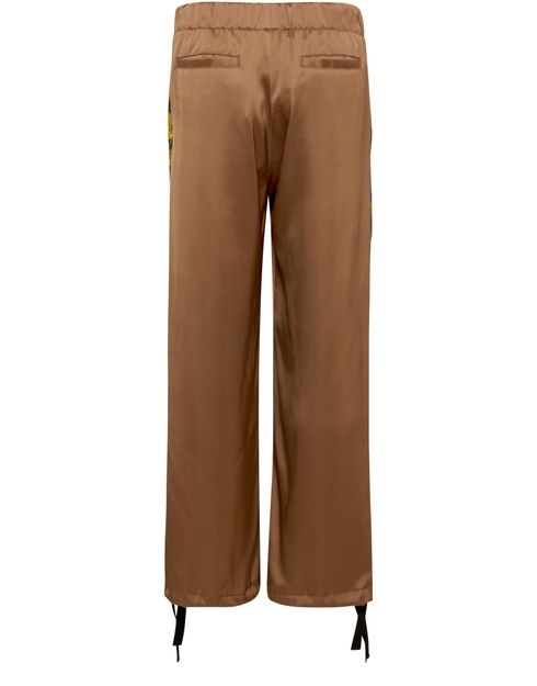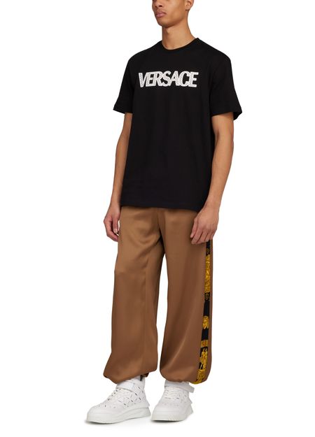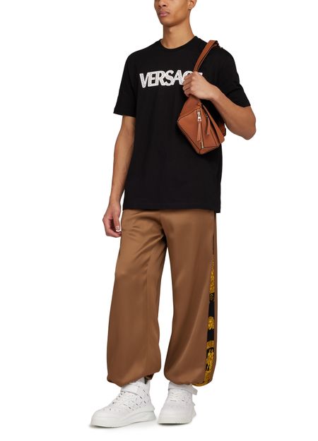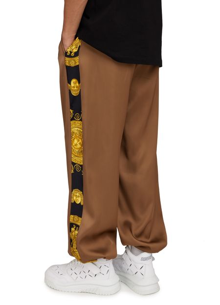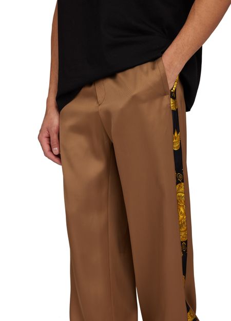 Versace's Heritage print large pants offer a stylish blend of comfort and functionality. Designed with side pockets and welt pockets, they provide ample storage. The back pocket adds a practical touch, while the ankle length and adjustable drawstring waist ensure a perfect fit, complemented by a trendy drawstring hem.