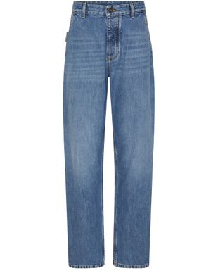 Discover Bottega Veneta's high-rise jeans, designed with a straight cut and ankle length for a modern silhouette. Featuring a buttoned and concealed zipper closure, side pockets, and a back patch pocket, these jeans showcase a stylish appliquéd logo at the back, complemented by visible stitching and a chic patch detail, complete with belt loops.