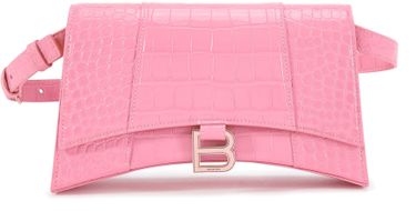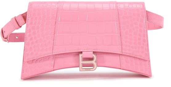 Balenciaga presents a sophisticated creation with captivating finishes. This hourglass baguette with strap perfectly accessorizes the creator's outfits. The lower part features the iconic arc shape and the logo-shaped clasp.