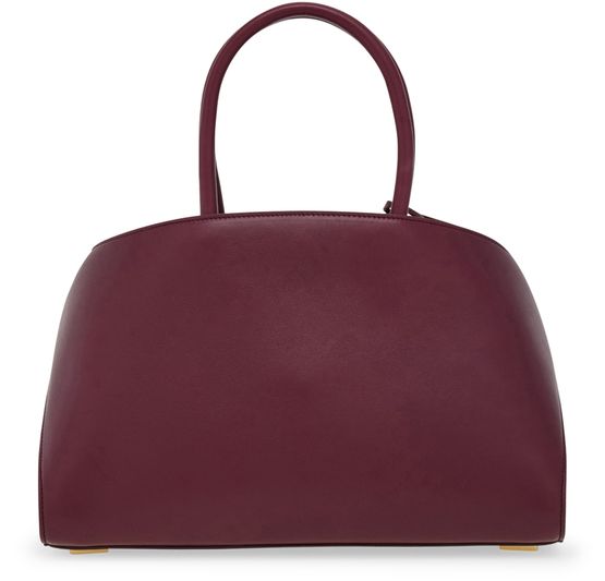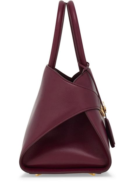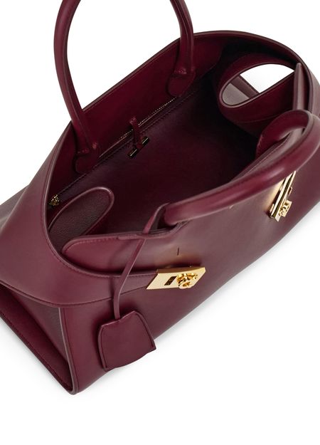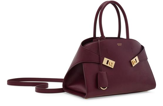 Reveal Salvatore Ferragamo's Hug handbag, crafted from smooth leather with a gold clasp and front logo. The double handles and thin, adjustable strap offer versatile carrying options, while the spacious interior and zippered pocket ensure both style and practicality for modern essentials.