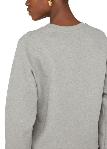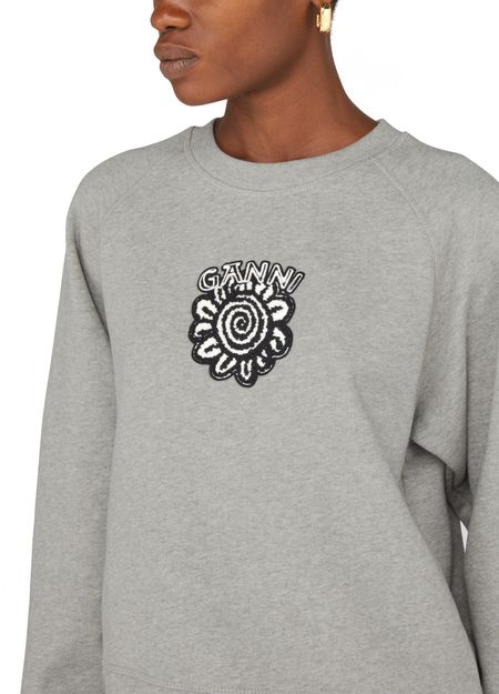 Ganni's Isoli Raglan Solid Sweatshirt is a long-sleeved, crew neck sweatshirt featuring a front logo and chest logo. It also has an appliquéd logo on the sleeve and a patch detail on the back label. This sweatshirt is perfect for adding a touch of casual style to any outfit.