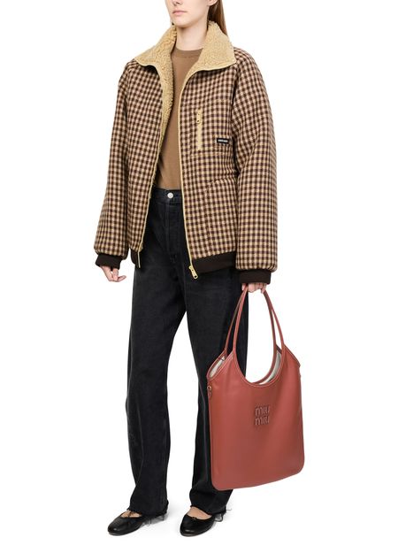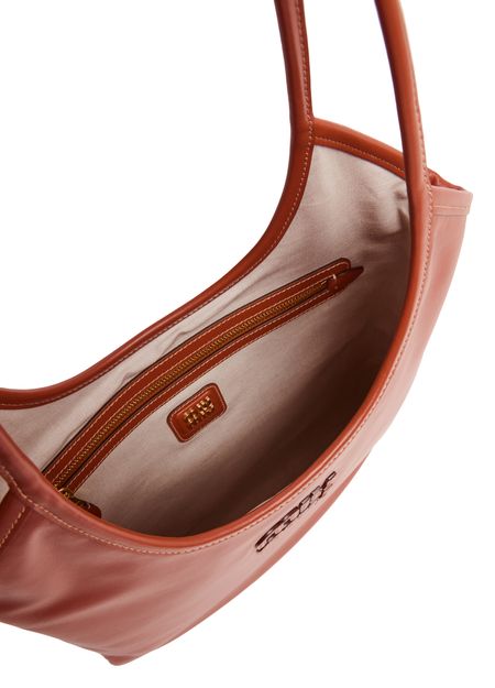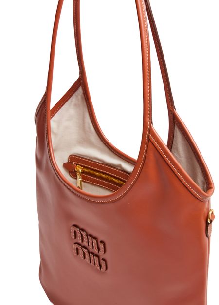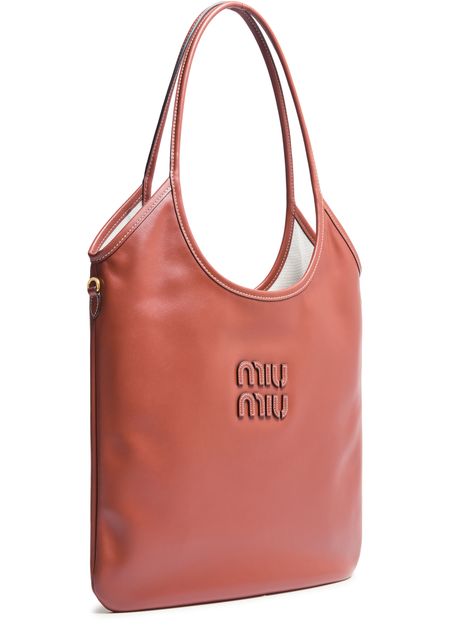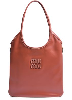 Reveal Miu Miu's Ivy leather bag, crafted from smooth leather with a padded texture and adorned with printed Miu Miu lettering. Double handles and a zippered interior pocket offer both style and practicality, while visible stitching and a large compartment complete this modern tote’s refined appeal.