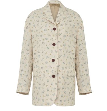 Description : Straight, wide cut, notched collar, long sleeves, buttoned fastening, all-over pattern, flap pockets, front slit, completes an outfit / Completes a look.