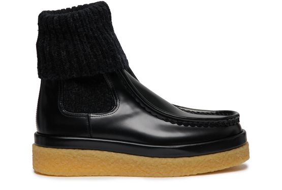 The Jamie boots from Chloé feature a bi-material design with smooth leather and scalloped edges. They have a round toe and high-top upper, with a ribbed texture and pull-on design for easy wear. The thick outsole provides sturdy support for all-day comfort and style.