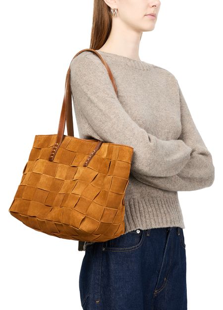 Reveal Dragon Diffusion's Japan tote bag, a masterpiece of style and functionality. Crafted from luxurious suede with a checked pattern, it features double handles and a spacious interior with a zippered pocket. The visible topstitching and zipper closure add a touch of sophistication to this elegant tote.