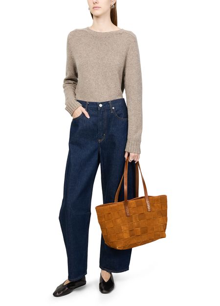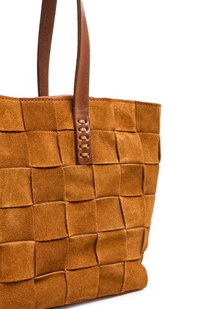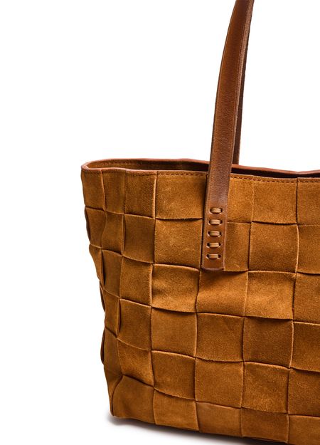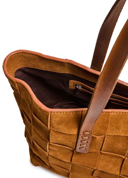 • Description : Shopper / tote bag, shoulder bag, double handles, leather handle, checked pattern, suede, zipper closure, zippered interior pocket, fabric, visible topstitching.
