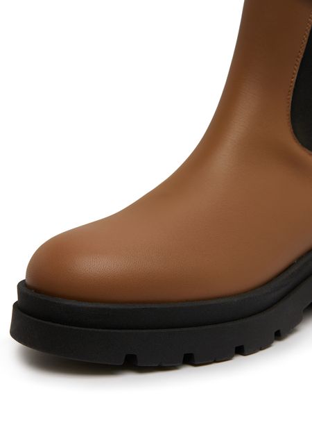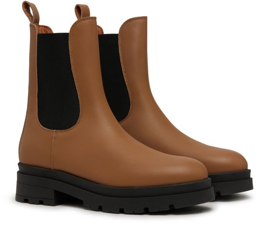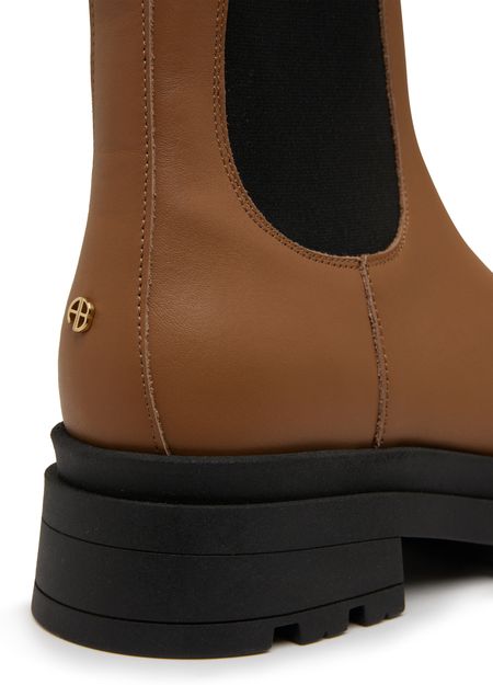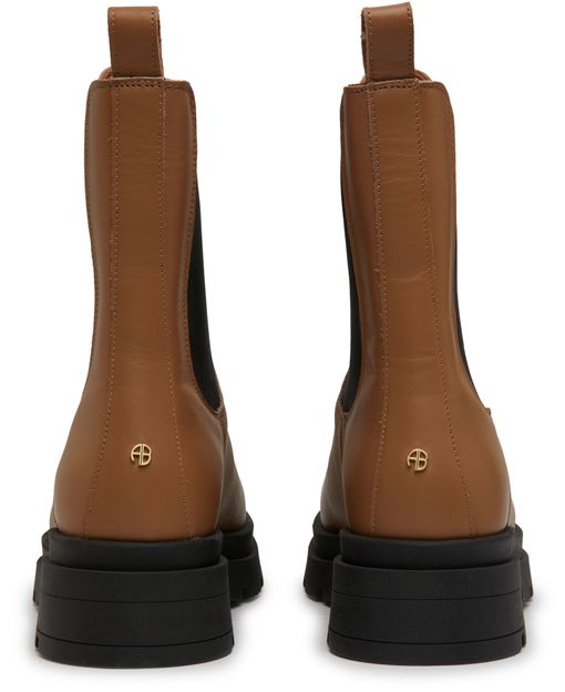 Justine boots are classic Chelsea boots crafted from smooth leather with a notched sole and square heel. They feature elasticated sides, the brand's monogram, and a leather loop at the back for easy slipping on and off. These pull-on boots are a timeless addition to any wardrobe.
