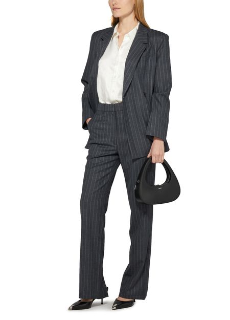 Anine Bing's Kaia blazer features a long-sleeved design with a double-breasted front and two-button closure. It includes two front pockets, welt pockets, and a breast pocket for added functionality. The notched collar and striped print enhance its stylish appearance, while the logo at the back label adds a distinctive touch.