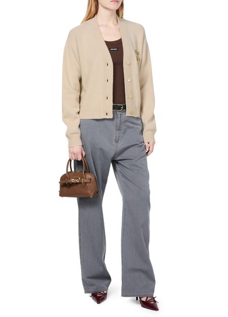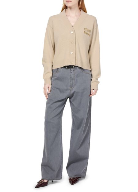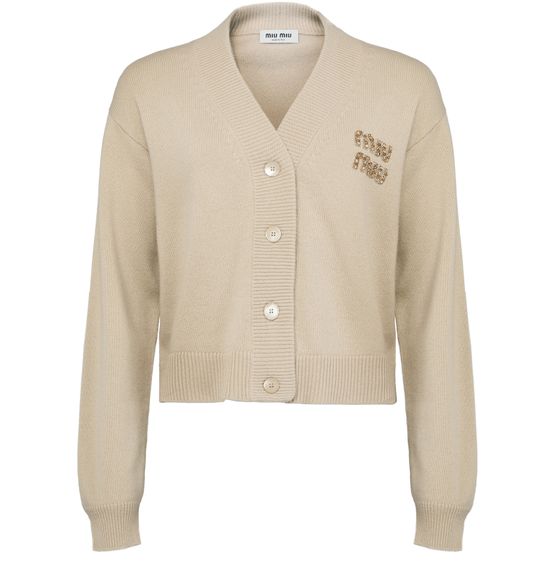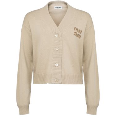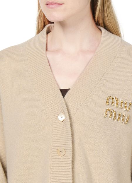 Miu Miu's knitted cashmere and silk cardigan showcases a short, long-sleeved silhouette with a front buttoned closure for effortless style. Cuffed sleeves add a touch of sophistication, while the chest logo subtly highlights the brand's elegance. This piece is perfect for layering, effortlessly elevating any outfit with luxury.