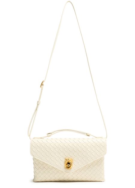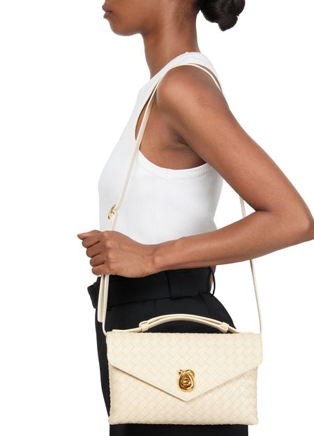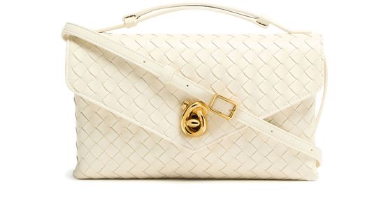 Unveil Bottega Veneta's Knot Lock crossbody bag - a masterpiece of modern elegance. Featuring an adjustable strap and double handles, this versatile bag can be hand carried or worn on the shoulder. The gold finish and twist lock closure highlight its sophisticated design, while the interior patch pockets add practicality.