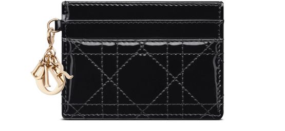 Introducing Dior's Lady Dior Freesia Card Holder – a masterpiece of elegance with detachable D.I.O.R. charms and five card slots. Made in Italy, it combines style with functionality, ensuring your cards are both secure and stylishly housed.