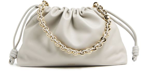 Loewe's Large Flamenco Purse in soft nappa lamb leather boasts a single compartment for effortless organization. Its single handle and detachable strap allow for versatile styling, whether worn on the shoulder or carried by hand. The front logo in gold letters and visible topstitching add a touch of sophistication.